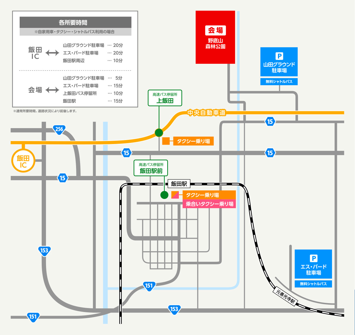 ※本年は「丸山小学校無料駐車場」並びに「飯田駅有料シャトルバス」は、運営・運行しておりません。